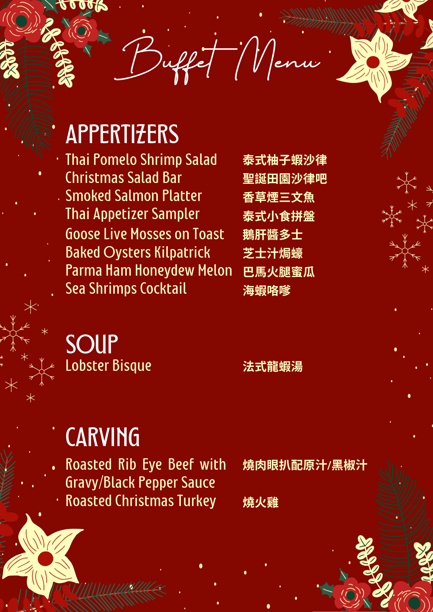 Looking for a festive gathering to celebrate earlier? Our Christmas Buffet Party is available throughout December for groups of 20 or more, perfect for a merry celebration with friends and family. Enjoy a wide array of dishes featuring Thai Pomelo Shrimp Salad, Roasted Rib Eye Beef, and delightful desserts like Crème Brûlée and Coconut Panna Cotta, all for $588 per person.